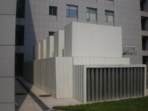 典型案例二:閉式冷卻塔噪聲治理 1、施工現(xiàn)場條件頂層采用閉式冷卻塔。閉式冷卻塔由11臺制冷機(jī)組組成,東西向排列三排。北距主樓約35-45米為水上商業(yè)樓;西側(cè)30-40米處是居民文化活動中心??紤]到閉式冷卻塔距離居民較近,距辦公樓約35-45米;閉式冷卻塔工作時會產(chǎn)生噪聲污染。 2、秉承社會經(jīng)濟(jì)、效益的基本原則,公司明確提出以下冷卻塔噪聲處理方法:1)在閉式冷卻塔東側(cè)安裝6米高的吸聲屏障,2.3距閉式冷卻塔1米,距東墻30厘米。吸音屏障長15.5米; 2)在閉式冷卻塔北側(cè)小墻上安裝隔音屏障,屏障高度與東側(cè)屏障頂部相同(屏障高約4.8米,高26米)長的)。 3)為了便于維修相鄰頂層設(shè)備,在北隔音屏障適當(dāng)位置設(shè)置一扇整體尺寸為2m*1m的隔音門。 4)吸音屏障主體部分:外側(cè)采用6mm厚FC實心板覆蓋,內(nèi)側(cè)80mm厚吸音棉,內(nèi)側(cè)采用4mm厚18%FC孔板覆蓋。 5)吸聲屏障基礎(chǔ)部分:東側(cè)采用混凝土基礎(chǔ),北側(cè)直接采用吸聲隔聲屏障。 6)為了減少施工預(yù)算,同時提高吸音屏障的使用效果和美觀效果,吸音屏障頂部改為倒檐。